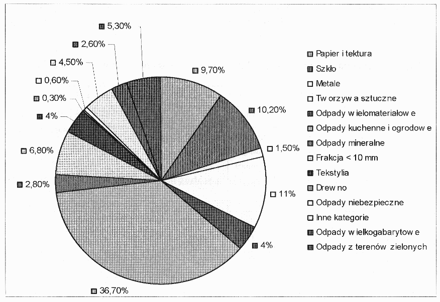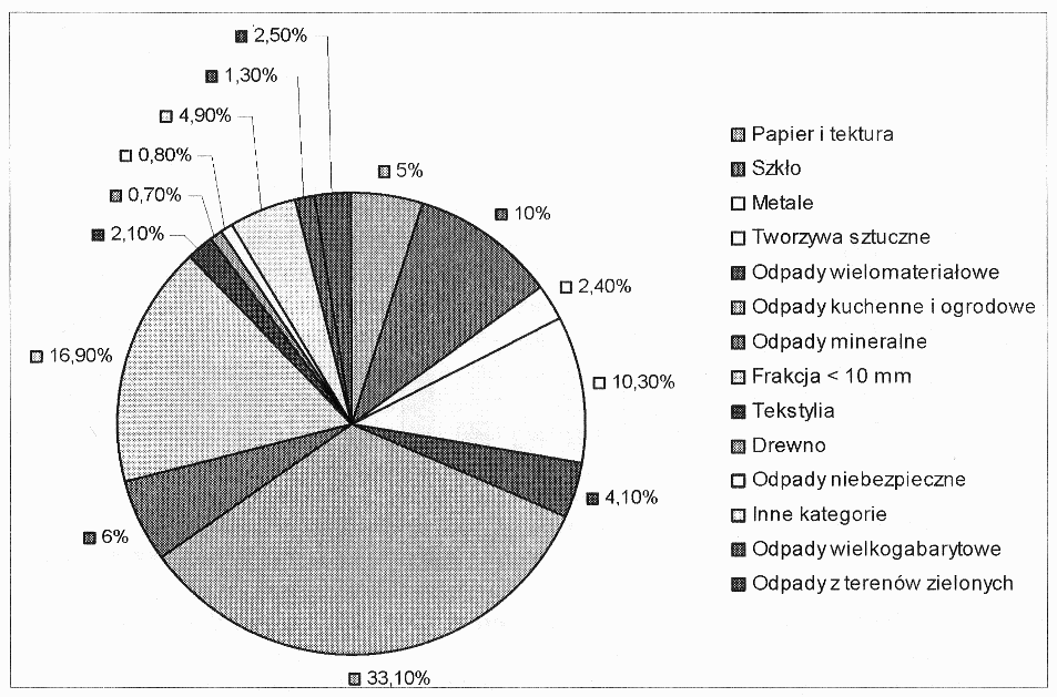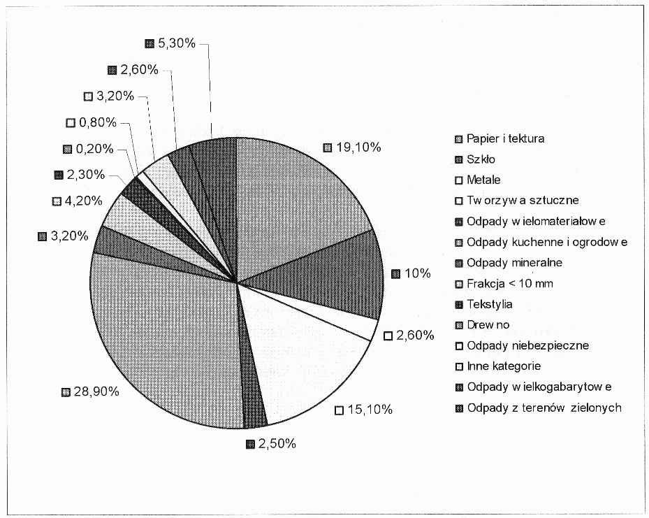 Rysunek 2. Skład morfologiczny odpadów komunalnych wytworzonych w małych miastach, tj. miastach liczących poniżej 50 tys. mieszkańców w 2008 r., w których mieszka 9,11 mln mieszkańców kraju (23,89 %)