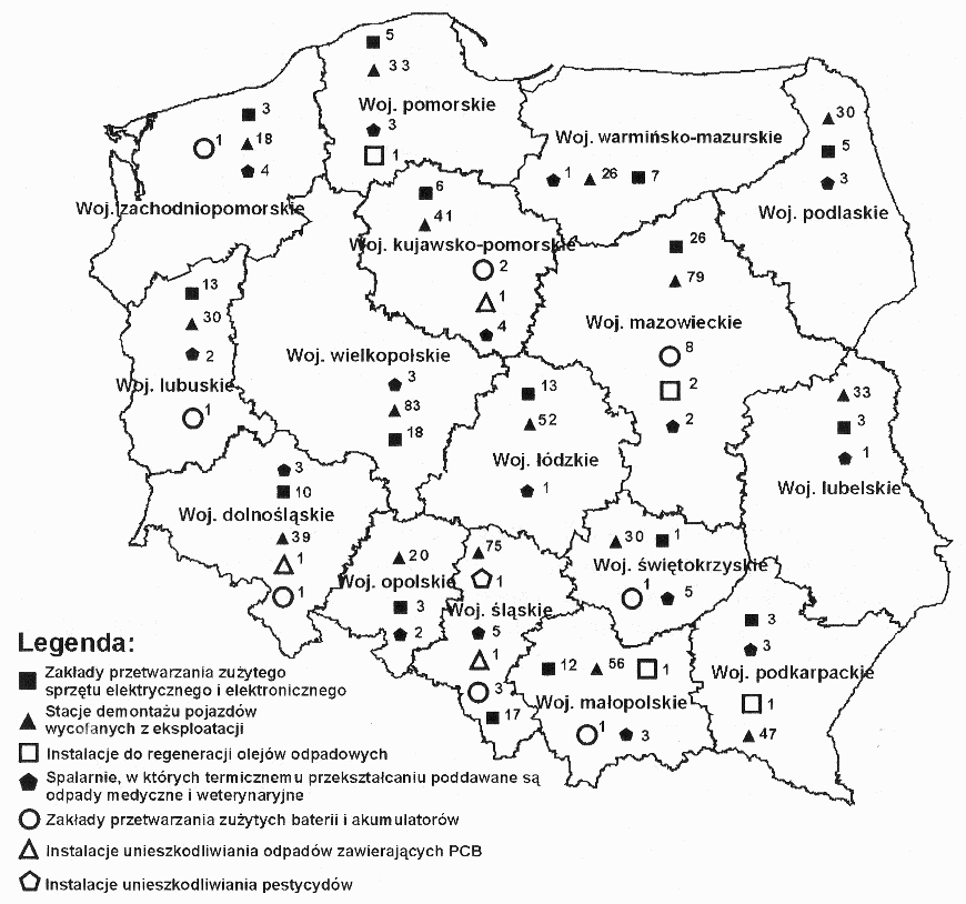 1) zgodnie z ustawą z dnia 24 kwietnia 2009 r. o bateriach i akumulatorach (Dz. U. Nr 79, poz. 666) 2) zgodnie z ustawą z dnia 27 kwietnia 2001 r. o odpadach (Dz. U. z 2010 r. Nr 185, poz. 1243 i Nr 203, poz. 1351) 3) według załącznika nr 1 do ustawy z dnia 29 lipca 2005 r. o zużytym sprzęcie elektrycznym i elektronicznym (Dz. U. Nr 180, poz. 1495, z późn. zm.), 4) określonych w ustawie z dnia 20 stycznia 2005 r. o recyklingu pojazdów wycofanych z eksploatacji (Dz. U. Nr 25, poz. 202, z późn. zm.) | |||