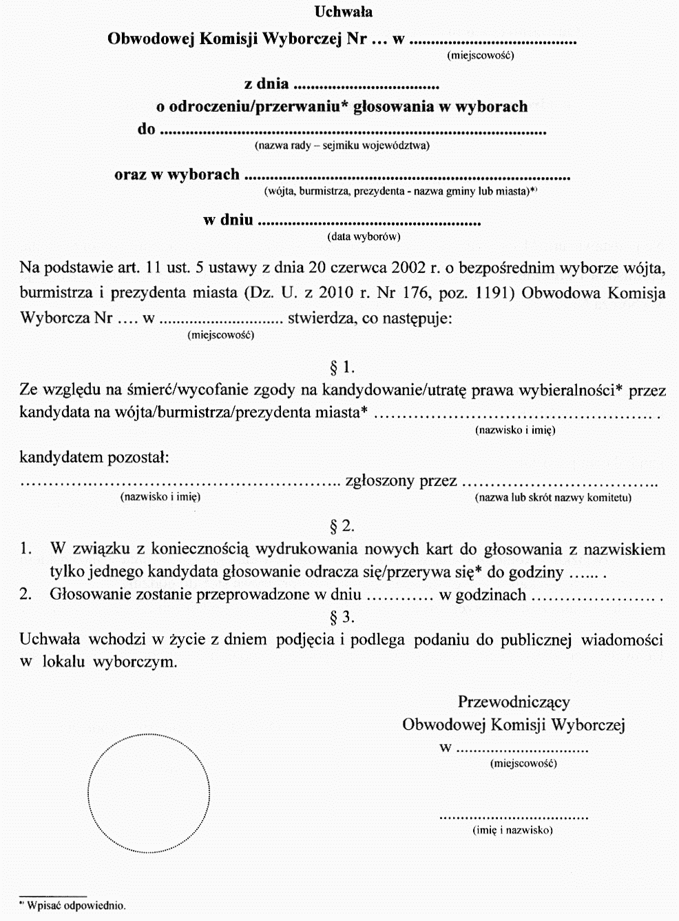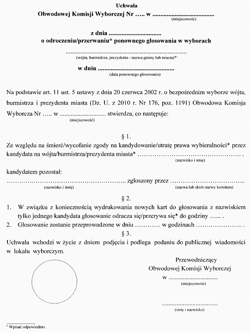 | Tytuł: | Wytyczne dla gminnych i obwodowych komisji wyborczych, dotyczące sposobu postępowania w sytuacji, gdy w wyborach wójta, burmistrza i prezydenta miasta lub w ponownym głosowaniu będzie uczestniczyć tylko jeden kandydat oraz gdy na skutek zmian na liście kandydatów warunkiem przeprowadzenia głosowania jest wydrukowanie nowych kart do głosowania. |