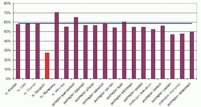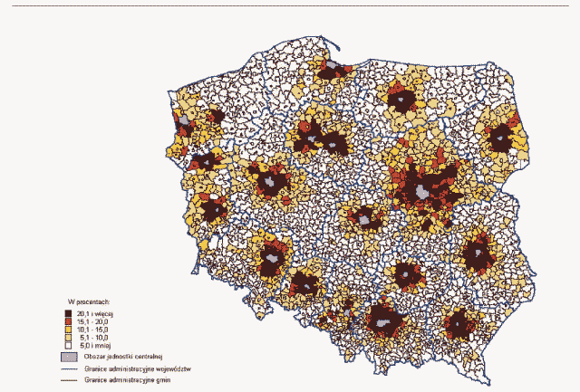 110 Udział PKB tworzonego w funkcjonalnym obszarze ośrodków wojewódzkich oszacowano przez zaliczenie do tego obszaru: miasta wojewódzkiego oraz przyległych powiatów o gęstości zaludnienia powyżej 150 osób/km2. Następnie obszarowi funkcjonalnemu przyporządkowano wielkości PKB poszczególnych NTS 3 na podstawie proporcji liczby ludności miasta wojewódzkiego oraz powiatów o gęstości zaludnienia powyżej 150 osób/km2 w ludności całego województwa. Konieczność szacowania PKB wynika z tego, że najniższym poziomem statystycznym, dla którego liczone jest PKB jest NTS 3, natomiast nie wszystkie miasta wojewódzkie stanowią odrębną jednostkę NTS 3