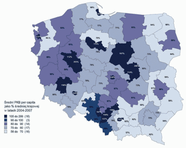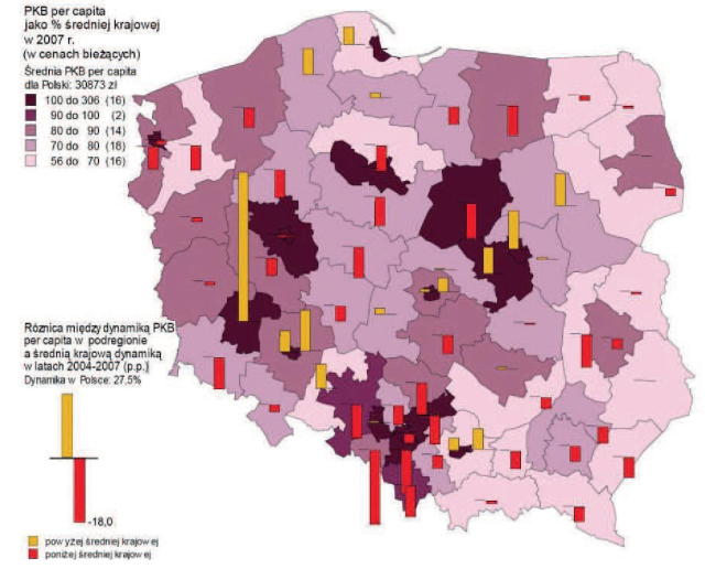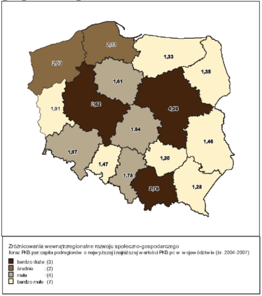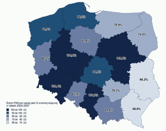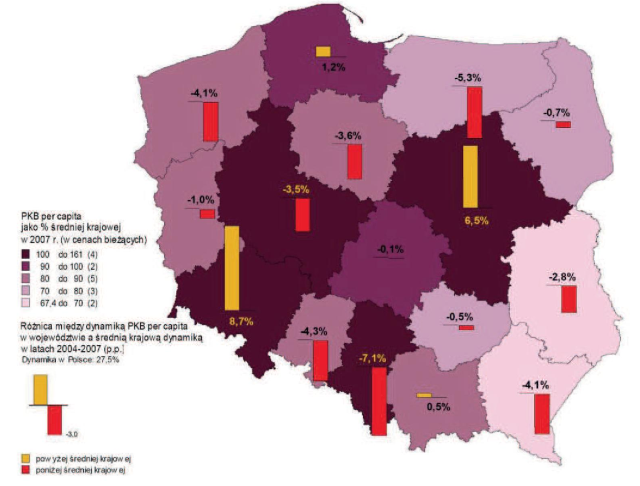 Mapa 8. Średnia wartość PKB per capita w cenach bieżących na poziomie województw w stosunku do średniej krajowej wiatach 2004-2007
