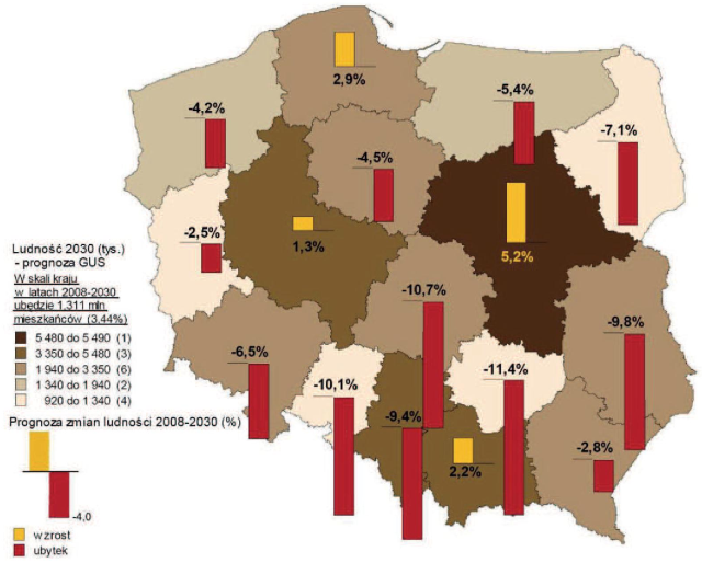 Mapa 18. Gęstość zaludnienia i zmiany ludnościowe w podregionach w latach 2000-2008