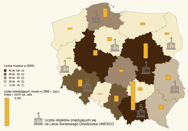 Mapa 27. Muzea i liczba zwiedzających w 2008 r. w Polsce wg województw wraz z obiektami znajdującymi się na liście światowego dziedzictwa UNESCO