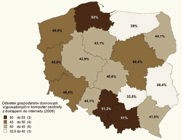Mapa 31. Odsetek gospodarstw domowych wyposażonych w komputer z dostępem do internetu (2008 r.) wg województw