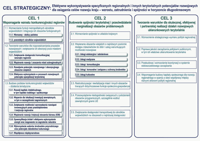 Dokument wprowadza kategorię obszarów, do których będzie w szczególny sposób adresowana polityka regionalna, które nazywa obszarami strategicznej interwencji (OSI). Obejmują one zarówno podstawowe obszary koncentracji procesów rozwoju społeczno-gospodarczego kraju i regionów, tj. główne ośrodki miejskie wraz z ich zapleczem funkcjonalnym, oraz obszary poza bezpośrednim zasięgiem oddziaływania tych ośrodków, które wymagają wzmocnienia potencjałów do rozwoju i stworzenia lub poprawy warunków dla zwiększenia absorpcji i rozprzestrzeniania procesów rozwojowych zogniskowanych w głównych ośrodkach miejskich, a także obszary problemowe, czyli terytoria cechujące się największą koncentracją negatywnych zjawisk rozwojowych o zasięgu i znaczeniu krajowym, lub ponadregionalnym.