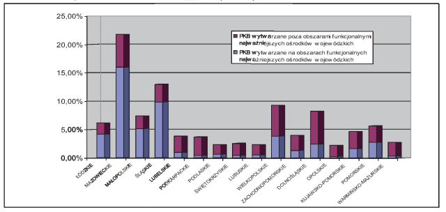 Mapa 6. Udział poszczególnych obszarów funkcjonalnych najważniejszych ośrodków wojewódzkich w tworzeniu PKB w stosunku do reszty regionu i kraju (2007 r.)