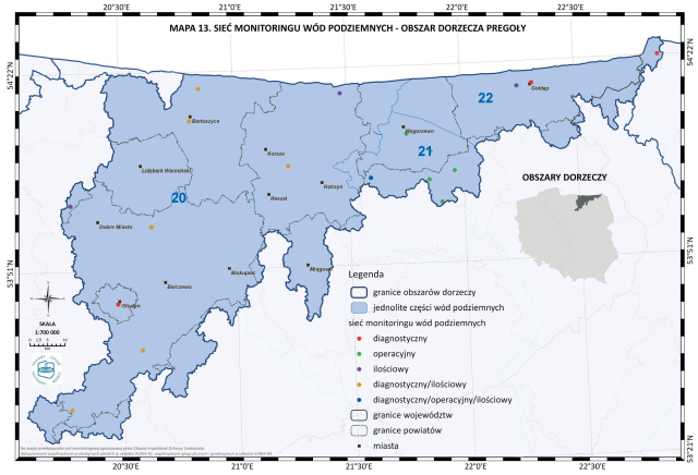 * Mapa 13. Sieć monitoringu wód podziemnych - obszar dorzecza Pregoły