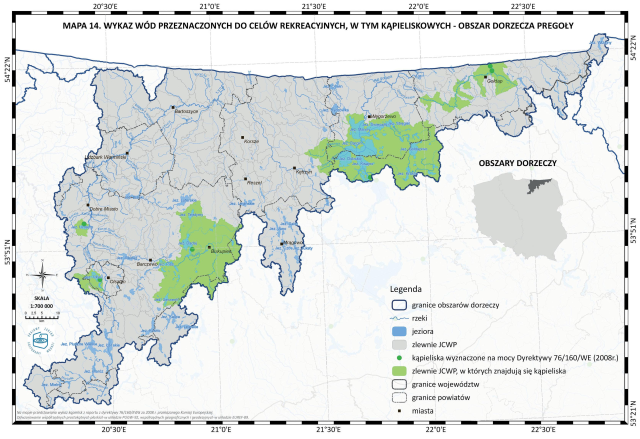 * Mapa 14. Wykaz wód przeznaczonych do celów rekreacyjnych, w tym kąpieliskowych - obszar dorzecza Pregoły