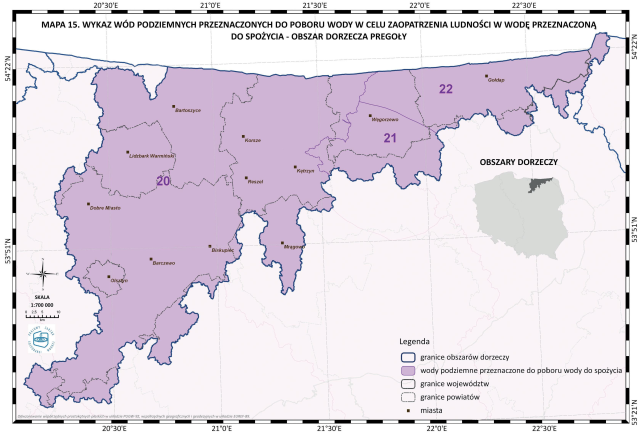 * Mapa 15. Wykaz wód podziemnych przeznaczonych do poboru wody w celu zaopatrzenia ludności w wodę przeznaczoną do spożycia - obszar dorzecza Pregoły