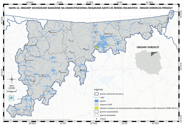* Mapa 16. Obszary szczególnie narażone na zanieczyszczenia związkami azotu ze źródeł rolniczych - obszar dorzecza Pregoły