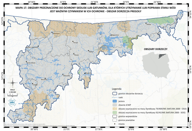 * Mapa 17. Obszary przeznaczone do ochrony siedlisk lub gatunków, dla których utrzymanie lub poprawa stanu wód jest ważnym czynnikiem w ich ochronie - obszar dorzecza Pregoły