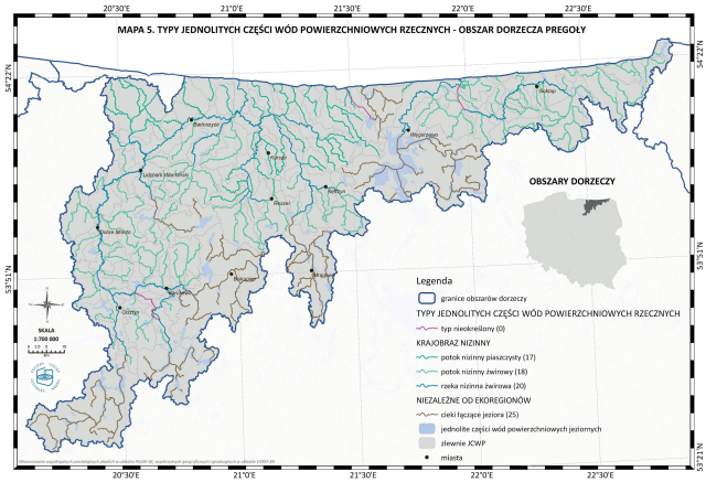 * Mapa 5. Typy jednolitych części wód powierzchniowych rzecznych - obszar dorzecza Pregoły