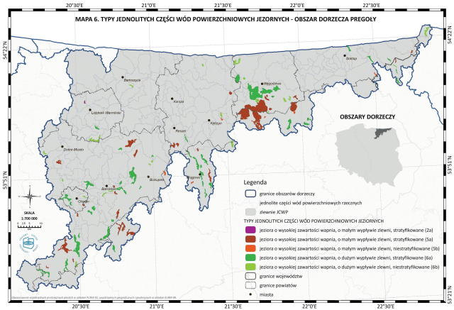 * Mapa 6. Typy jednolitych części wód powierzchniowych jeziornych - obszar dorzecza Pregoły