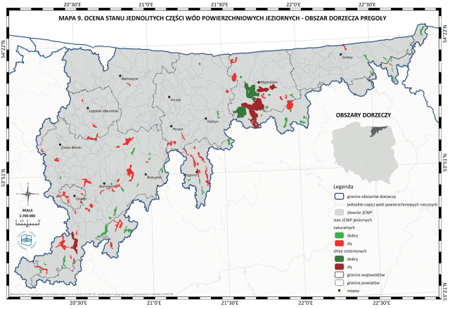 * Mapa 9. Ocena stanu jednolitych części wód powierzchniowych jeziornych - obszar dorzecza Pregoły