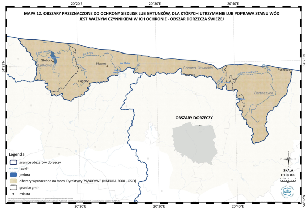 * Mapa 12. Obszary przeznaczone do ochrony siedlisk lub gatunków, dla których utrzymanie lub poprawa stanu wód jest ważnym czynnikiem w ich ochronie - obszar dorzecza Świeżej