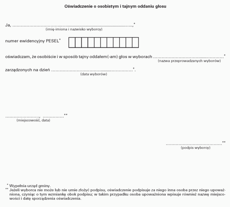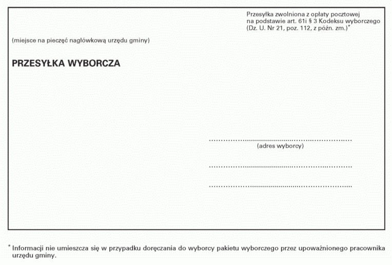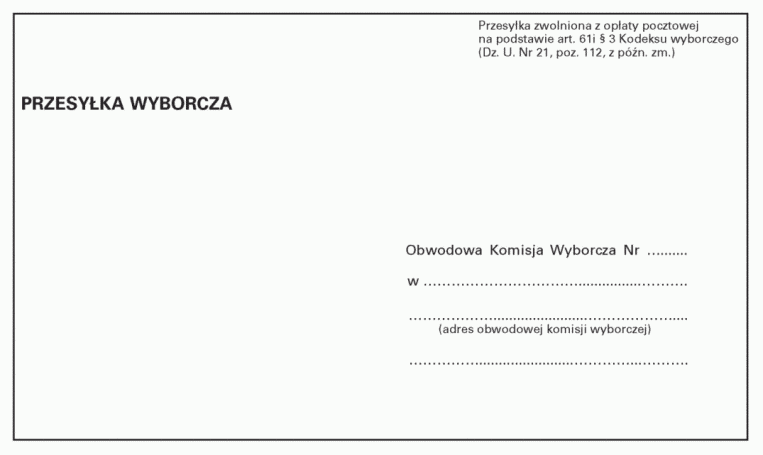 | Tytuł: | Określenie wzoru i rozmiaru koperty na pakiet wyborczy, koperty zwrotnej, koperty na kartę do głosowania, oświadczenia o osobistym i tajnym oddaniu głosu oraz instrukcji głosowania, stosowanych w głosowaniu korespondencyjnym w obwodach głosowania utworzonych w kraju. |