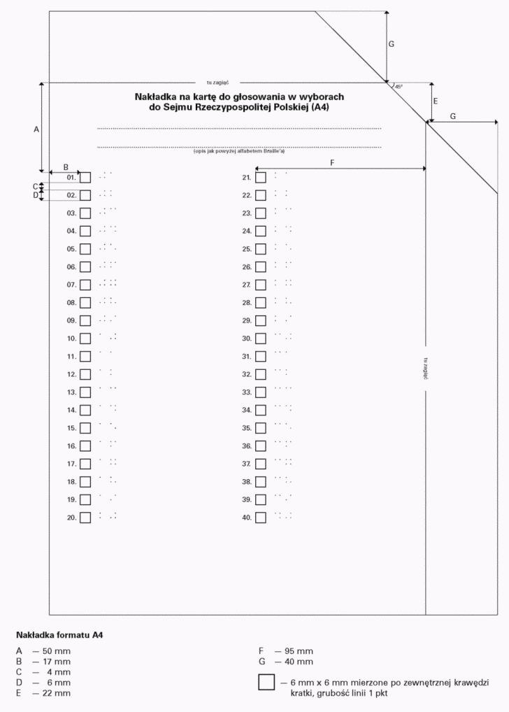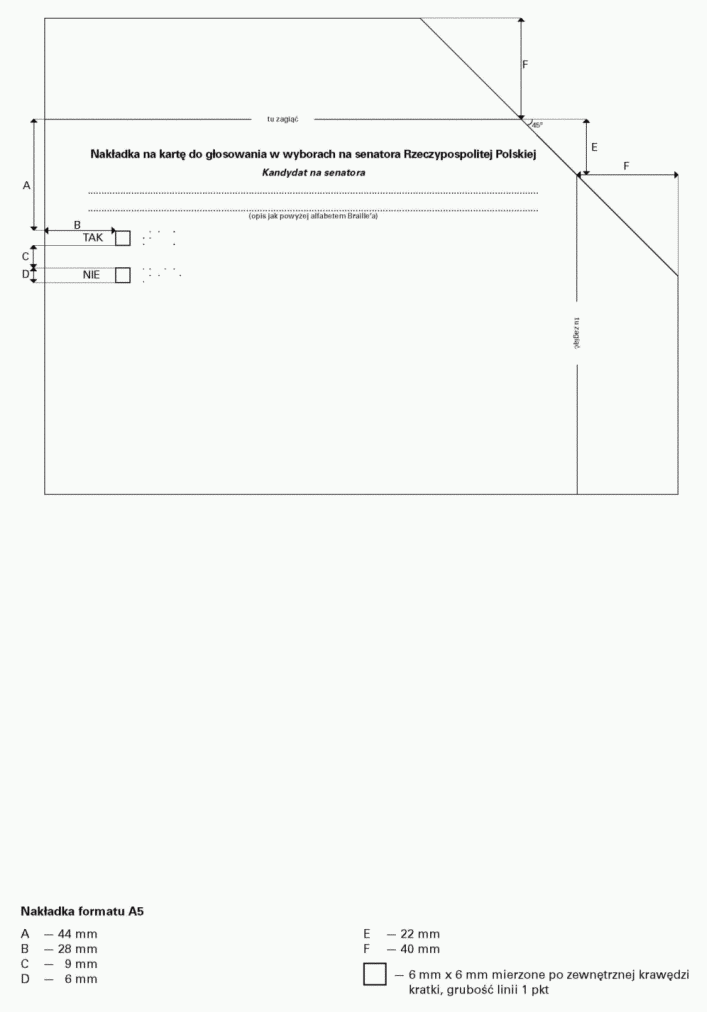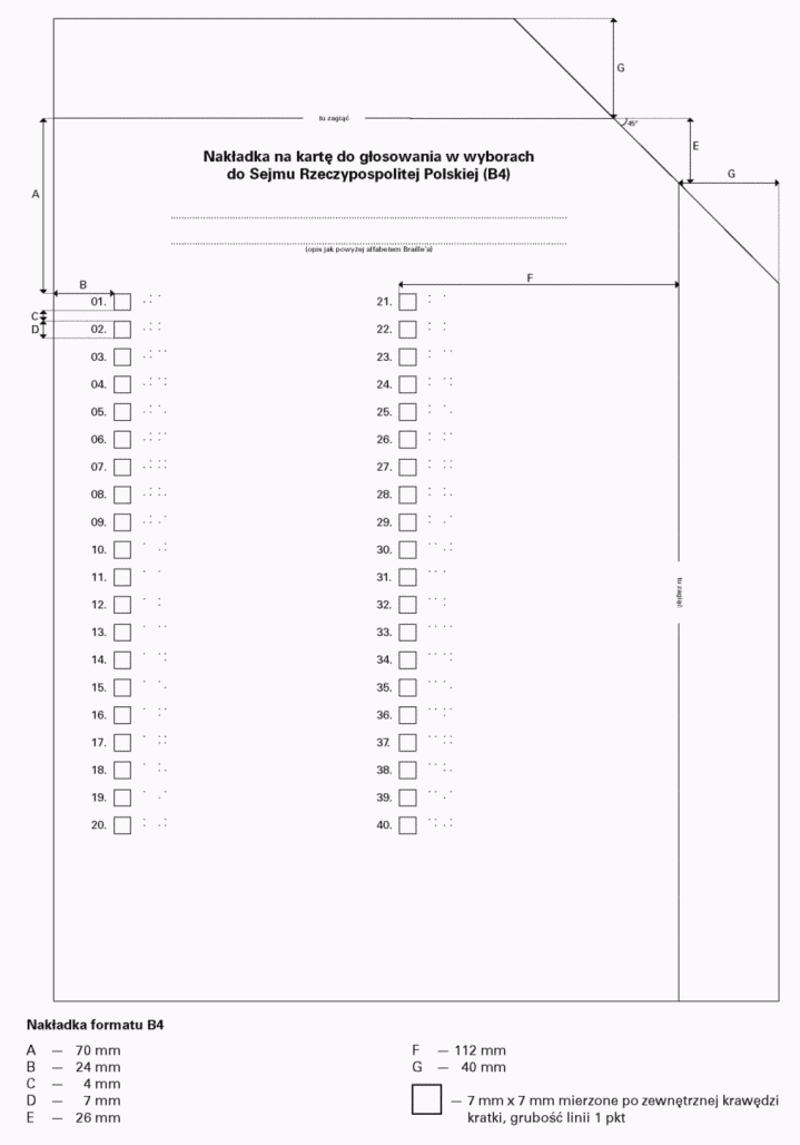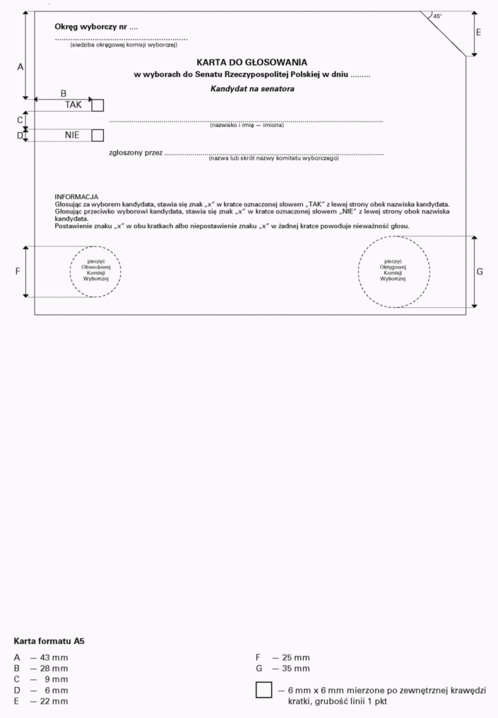 | Tytuł: | Wzory kart do głosowania oraz nakładek na karty do głosowania sporządzonych w alfabecie Braille’a, w wyborach do Sejmu Rzeczypospolitej Polskiej i do Senatu Rzeczypospolitej Polskiej dla obwodów głosowania utworzonych w kraju. |