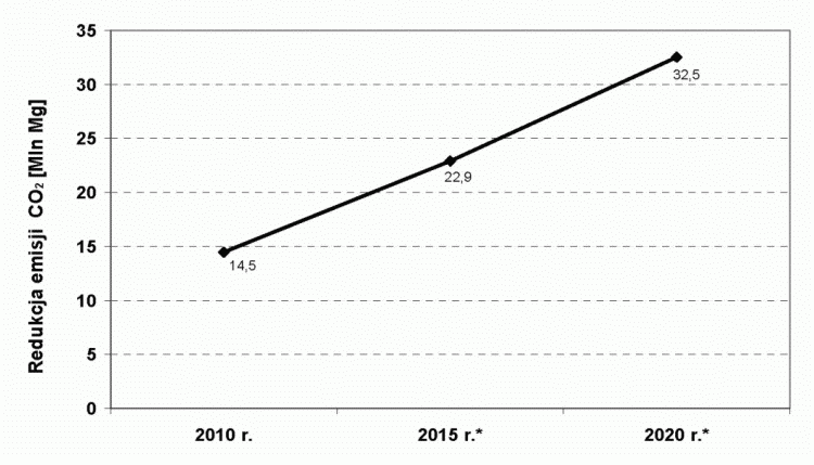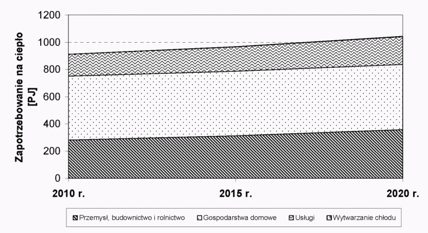 Poniżej przedstawiono prognozę zapotrzebowania na ciepło w sektorze gospodarstw domowych opartą na prognozach liczby ludności, powierzchni użytkowej mieszkań oraz wskaźników zużycia ciepła do przygotowania CWU i wskaźnika standardu cieplnego. Założono, że wskaźnik liczby osób w jednym mieszkaniu będzie spadał od wartości 2,87 (w 2009 r.) do 2,54 w 2020 r. Ponadto przyjęto, że wskaźnik przeciętnej powierzchni użytkowej jednego mieszkania wzrośnie z 70,5 m2 w 2009 r. do 73,2 m2 w 2020 r. Średni wskaźnik standardu cieplnego dla 2005 r. w gospodarstwach domowych wynosi 120 kWh/m2. Założono, że do 2020 r. wskaźnik ten będzie ulegał poprawie (redukcji) o 1 % r/r.