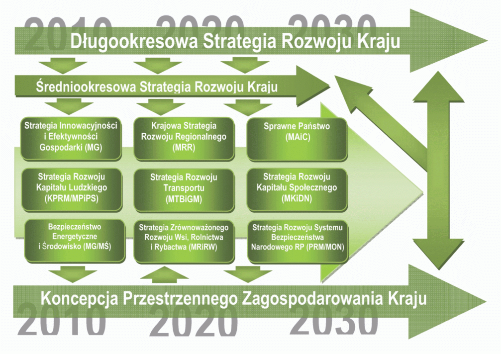 Ramy nowego porządku strategicznego stanowi - Długookresowa Strategia Rozwoju Kraju (DSRK "Polska 2030. Trzecia fala nowoczesności") oraz Koncepcja Przestrzennego Zagospodarowania Kraju (por. rys. poniżej). W tak zdefiniowanych granicach mieścić się będzie Średniookresowa Strategia Rozwoju Kraju 2020 (ŚSRK) stanowiąca najważniejszy dokument w perspektywie średniookresowej, określająca cele strategiczne rozwoju kraju do 2020 roku skorelowane z europejskim dokumentem programowym "Europa 2020", oraz 9 strategiami zintegrowanymi - wskazanymi w "Planie uporządkowania strategii rozwoju". Ważnym elementem porządku planowania strategicznego w odniesieniu do dokumentu "Europa 2020" jest Krajowy Program Reform, a także cyklicznie aktualizowane: Wieloletni Plan Finansowy Państwa oraz Program Konwergencji.