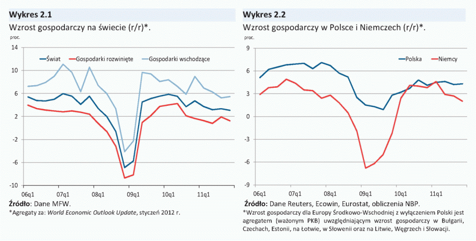 Napływające w IV kw. 2011 r. dane wskazywały, iż tempo wzrostu gospodarczego na świecie w III kw. 2011 r. kształtowało się na niskim poziomie, przy jednocześnie znacznym zróżnicowaniu koniunktury w poszczególnych krajach. W Stanach Zjednoczonych tempo wzrostu PKB przyspieszyło, zaś w strefie euro ukształtowało się jedynie nieznacznie powyżej zera. Równocześnie w Niemczech dynamika PKB w III kw. 2011 r. - wspierana przez korzystną sytuację na rynku pracy oraz relatywnie wysoki wzrost gospodarczy w Azji - wzrosła, choć napływające dane miesięczne wskazywały na osłabienie koniunktury w tej gospodarce w IV kw. 2011 r. W największych gospodarkach wschodzących wzrost gospodarczy w III kw. 2011 r. spowalniał, co w większości z nich w dużym stopniu wynikało z wcześniejszego zacieśnienia polityki makroekonomicznej.