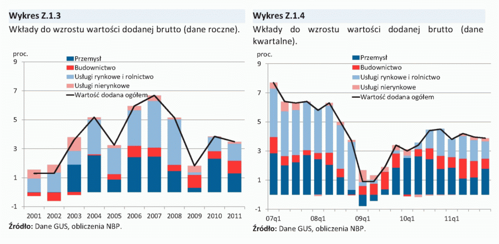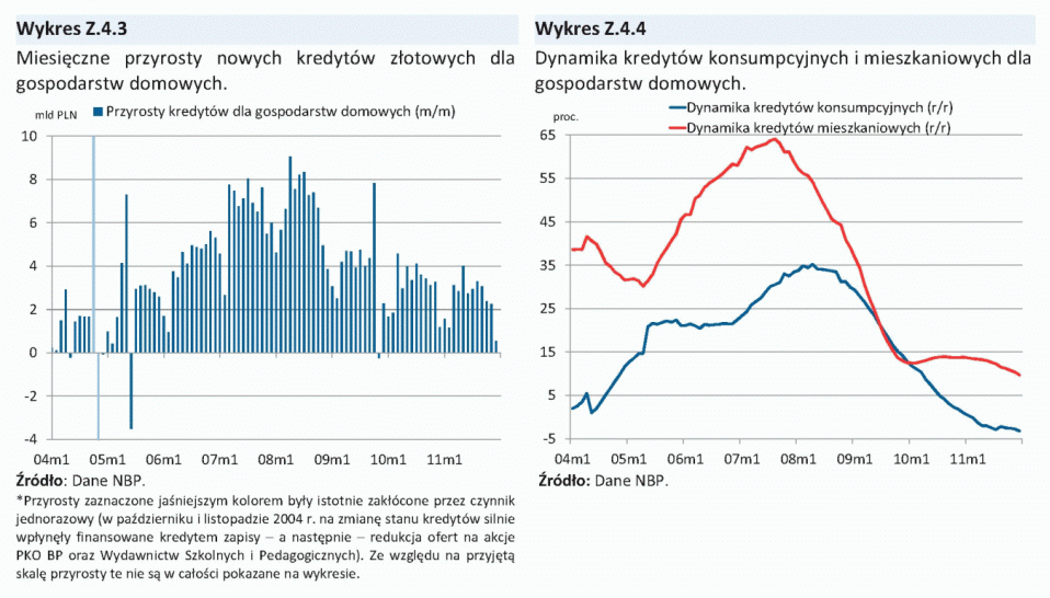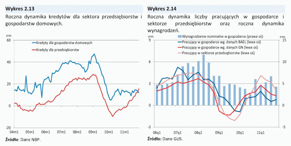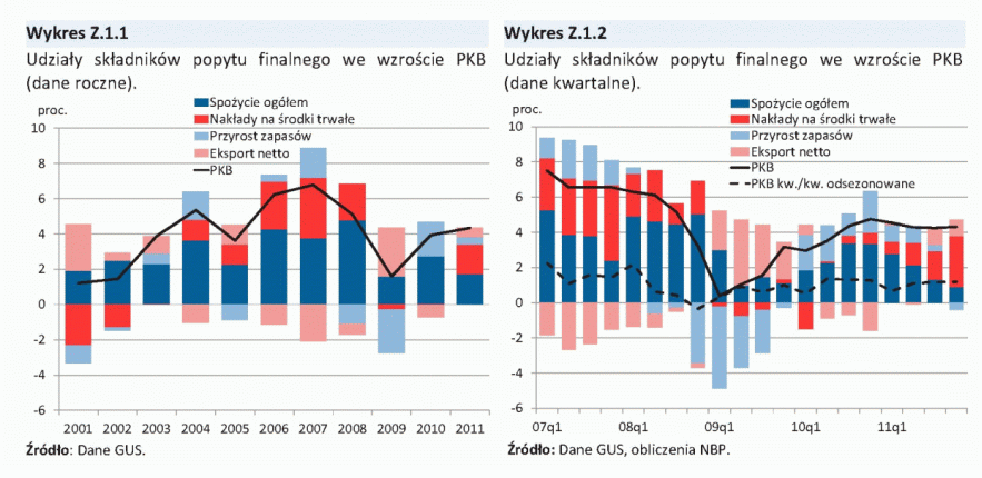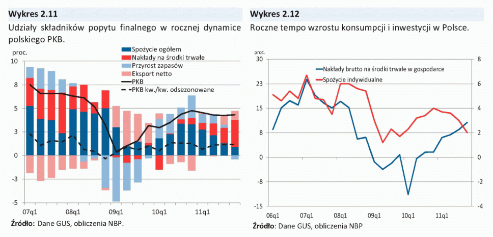 W kierunku osłabienia wzrostu popytu konsumpcyjnego gospodarstw domowych oddziaływał niski wzrost realnych dochodów do dyspozycji, związany z obniżoną dynamiką zatrudnienia w II połowie 2011 r., podwyższoną inflacją i niskim tempem wzrostu świadczeń społecznych. Dodatkowym czynnikiem osłabiającym konsumpcję prywatną w II połowie 2011 r. była deprecjacja złotego i związany z nią wzrost złotowej wartości wcześniej zaciągniętych kredytów walutowych, a także zaostrzenie warunków i kryteriów udzielania kredytów konsumpcyjnych dla gospodarstw domowych. W tych warunkach pogorszyły się nastroje gospodarstw domowych, co też miało negatywny wpływ na dynamikę konsumpcji. Jednocześnie, w 2011 r. systematycznie przyspieszał wzrost inwestycji. Istotne znaczenie dla wzrostu nakładów inwestycyjnych miała wysoka dynamika inwestycji publicznych związana z napływem środków unijnych. Ponadto, przyspieszył wzrost inwestycji przedsiębiorstw, czemu sprzyjało stosunkowo wysokie wykorzystanie mocy produkcyjnych oraz korzystna sytuacja finansowa firm. W 2011 r., po spadku w poprzednim roku, zwiększyły się także inwestycje mieszkaniowe gospodarstw domowych.