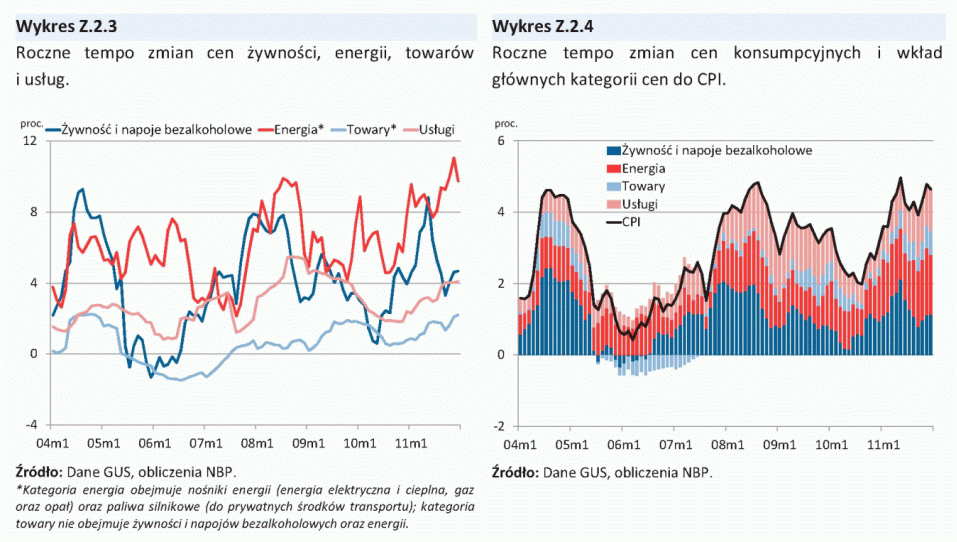 W omawianym okresie roczna inflacja CPI ponownie wzrosła, pozostając wyraźnie powyżej celu inflacyjnego NBP (w IV kw. 2011 r. wyniosła średnio 4,6% r/r), co wpływało na utrzymywanie się podwyższonych oczekiwań inflacyjnych. Wzrost inflacji był w dużym stopniu związany ze znacznym osłabianiem się kursu złotego od sierpnia 2011 r., które wynikało z utrzymywania się podwyższonej awersji do ryzyka. Znaczące osłabienie się kursu złotego przyczyniało się zarówno do wzrostu cen energii (w tym zwłaszcza paliw) i żywności, jak również pozostałych towarów importowanych. W rezultacie deprecjacja złotego prowadziła także do wzrostu inflacji bazowej.