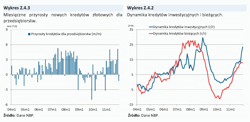 Dane dotyczące polskiej gospodarki wskazywały, iż wzrost PKB w III kw. 2011 r. pozostał relatywnie wysoki (4,2% r/r), co nadal wynikało głównie ze wzrostu popytu krajowego. Równocześnie istotnie zwiększył się wkład eksportu netto do wzrostu PKB, czemu sprzyjała deprecjacja złotego. Choć wskaźniki koniunktury w dalszym ciągu sygnalizowały możliwość pewnego osłabienia się aktywności gospodarczej, w IV kw. 2011 r. wzrost produkcji przemysłowej, budowlano-montażowej oraz sprzedaży detalicznej pozostał wysoki. Równocześnie akcja kredytowa dla przedsiębiorstw nadal rosła oraz utrzymywał się relatywnie szybki wzrost złotowych kredytów hipotecznych dla gospodarstw domowych przy wciąż ujemnej dynamice kredytów konsumpcyjnych.