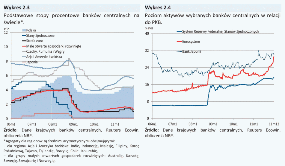 W 2011 r. banki centralne w największych gospodarkach rozwiniętych zwiększyły skalę ekspansji monetarnej, choć w ciągu roku ich polityka cechowała się pewnym zróżnicowaniem (Wykres 2.3, Wykres 2.4). Bank Rezerwy Federalnej (Fed) oraz Bank Japonii (BJ) utrzymywały stopy procentowe na poziomie bliskim zera. Europejski Bank Centralny (EBC) w I połowie 2011 r. podniósł dwukrotnie stopy procentowe, po czym w IV kwartale 2011 r. dwukrotnie obniżył je do poziomu sprzed podwyżek. Do połowy 2011 r. Fed kontynuował programy zakupu aktywów rozpoczęte w 2010 r. W II połowie 2011 r., w reakcji na pojawiające się oznaki spowolnienia wzrostu gospodarczego, Fed rozpoczął wydłużanie przeciętnego terminu zapadalności posiadanych aktywów (tzw. operacja twist). BJ oraz EBC kontynuowały program ilościowego łagodzenia polityki pieniężnej w całym 2011 r. W II połowie 2011 r. EBC zdecydował się na uzupełnienie istniejących programów płynnościowych o roczne i trzyletnie długoterminowe operacje refinansowe. Polityka pieniężna w wielu gospodarkach wschodzących, a także w małych otwartych gospodarkach rozwiniętych, po zaostrzeniu w 2010 r. i w I połowie 2011 r., w drugim półroczu 2011 r. została - odmiennie od polityki pieniężnej w Polsce - złagodzona w warunkach pogorszenia globalnej koniunktury i osłabienia presji inflacyjnej.
