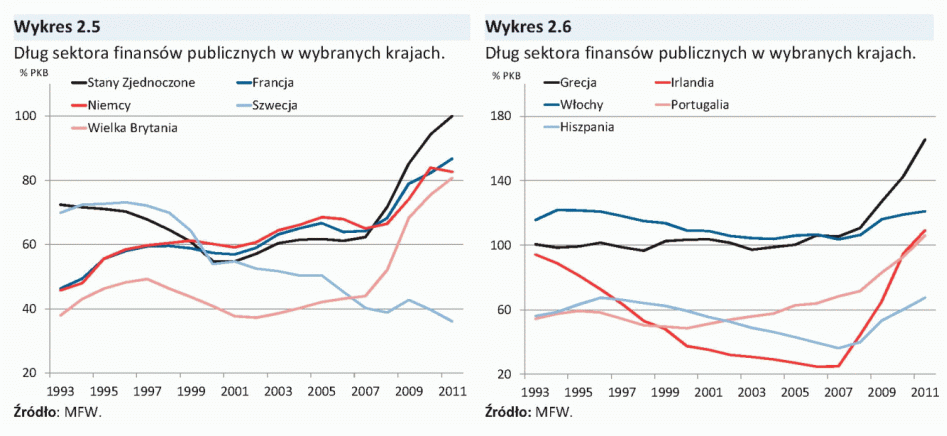 W 2011 r., pomimo działań rządów mających na celu ograniczenie nierównowagi sektora finansów publicznych, w większości krajów rozwiniętych deficyt sektora finansów publicznych pozostał na wysokim poziomie, a dług publiczny nadal rósł (Wykres 2.5, Wykres 2.6). Działania niektórych rządów, przede wszystkim krajów peryferyjnych strefy euro, w zakresie zmniejszania nierównowag fiskalnych były oceniane przez inwestorów jako niewystarczające, co doprowadziło do nasilenia obaw o wypłacalność tych krajów. Odzwierciedleniem tych obaw był znaczący wzrost rentowności i obniżenie ratingów obligacji emitowanych przez wiele krajów strefy euro i nasilenie zaburzeń na międzynarodowych rynkach finansowych (Wykres 2.8).