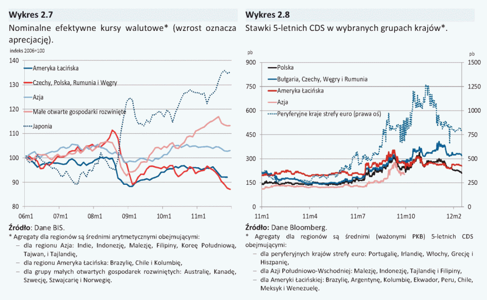 Wzrost awersji do ryzyka na międzynarodowych rynkach finansowych na skutek nasilenia się obaw o sytuację fiskalną niektórych krajów strefy euro w II połowie 2011 r. przyczynił się do deprecjacji i wzrostu zmienności kursów walutowych krajów wschodzących, w tym kursu złotego. W tym okresie Rada podkreślała, że wpływ sytuacji na rynkach finansowych na kształtowanie się kursu złotego może przejściowo dodatkowo podnieść inflację. NBP kilkakrotnie interweniował na rynku walutowym sprzedając waluty obce za złote, co ograniczyło zmienność kursu złotego.