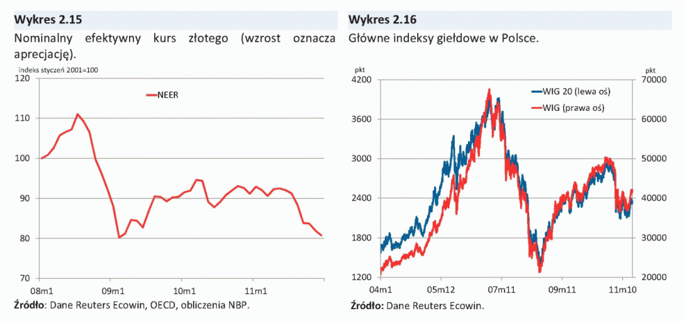 Równocześnie w III kw. 2011 r. wraz z obniżeniem ratingu amerykańskich długoterminowych obligacji skarbowych, nastąpił znaczny spadek cen akcji oraz obniżyły się ceny surowców na rynkach światowych. Wobec podwyższonej awersji do ryzyka na międzynarodowych rynkach finansowych osłabiły się waluty krajów wschodzących, w tym znacznie osłabił się kurs złotego.