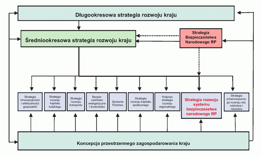 Długookresowa strategia rozwoju kraju Polska 2030. Trzecia fala nowoczesności uznaje zapewnienie bezpieczeństwa zewnętrznego i wewnętrznego za warunek niezbędny dla pomyślnego rozwoju Polski6. Podobne podejście prezentuje średniookresowa Strategia Rozwoju Kraju 2020 (ŚSRK), uznając Utrwalanie bezpieczeństwa narodowego (1.3.4) za jeden z priorytetowych kierunków interwencji publicznej w obszarze strategicznym Sprawne i efektywne państwo. W szczególności ŚSRK wskazuje na potrzebę "podjęcia i szybkiego zakończenia prac nad zintegrowanym systemem bezpieczeństwa państwa"7.
