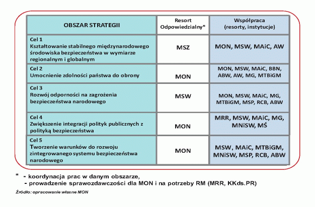 Kierunki działań niniejszej strategii będą zorientowane na dwie naczelne zasady: efektywności i spójności - stąd też jej głównym celem będzie Wzmocnienie efektywności i spójności systemu bezpieczeństwa narodowego. Efektywność będzie osiągana poprzez podnoszenie sprawności zasadniczych elementów systemu bezpieczeństwa narodowego - służyć temu będzie realizacja celu pierwszego Kształtowanie stabilnego międzynarodowego środowiska bezpieczeństwa w wymiarze regionalnym i globalnym, celu drugiego Umocnienie zdolności państwa do obrony oraz celu trzeciego Rozwój odporności na zagrożenia bezpieczeństwa narodowego. Dzięki realizacji celu czwartego Zwiększenie integracji polityk publicznych z polityką bezpieczeństwa i piątego Tworzenie warunków do rozwoju zintegrowanego systemu bezpieczeństwa narodowego zapewniona zostanie spójność systemu bezpieczeństwa narodowego (na zewnątrz i do wewnątrz). Zaproponowane działania z zakresu spójności będą realizowane etapowo - w pierwszej kolejności będą ukierunkowane na zwiększanie współpracy i koordynacji, w dalszej - na integrację. Cele 1, 2 i 3 mają zatem charakter operacyjny (wykonawczy), zaś cele 4 i 5 - systemowo-koordynacyjny.
