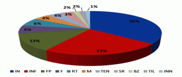 IN - inne, INF - infrastruktura, FP - spójność z innymi dokumentami, F - finansowanie, RT - rynki transportowe/przewoźnicy, M - monitoring, TEN - sieć TEN-T,