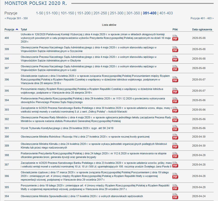 - Jeśli nie ma ustawowego wyłączenia, uchwała, by zaczęła obowiązywać, musi zostać opublikowana - podkreśla prof. Piotrowski. W przepisach, w tym ustawie o systemie instytucji rozwoju nie ma takiego wyłączenia. Uchwała jest podjęta na podstawie jej art. 21a. Czytamy w nim m.in., że Rada Ministrów, w związku ze skutkami COVID-19, może powierzyć PFR realizację rządowego programu udzielania przedsiębiorcom wsparcia finansowego, a program określa w szczególności warunki i okres udzielania przedsiębiorcom wsparcia finansowego, sposób przygotowania i elementy rocznych planów udzielania tego finansowania oraz sprawozdawczości z ich realizacji. Nie ma w nim słowa o tym, że uchwała nie musi być publikowana. Mimo to nie ma jej w MP (patrz print screen na dole artykułu)