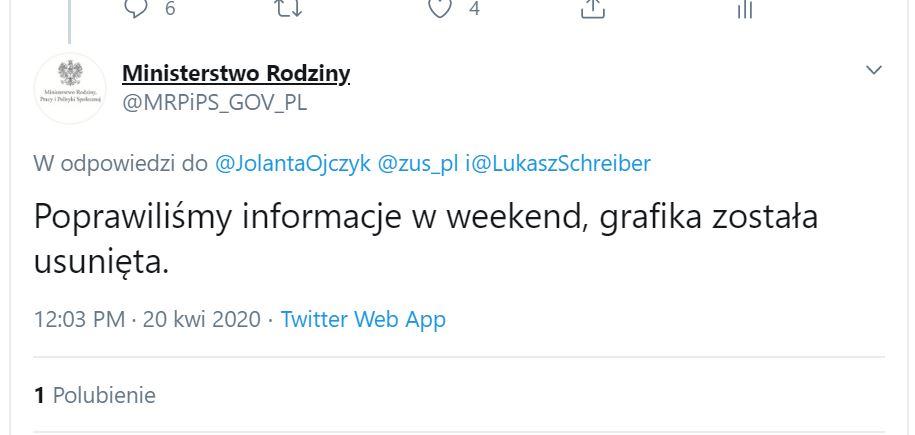 Tyle, że w czwartek 16 kwietnia w trakcie głosowania poprawek senackich w Sejmie również pojawiła się informacja o tym, że limit przychodów dla samozatrudnionych ubiegających się o zwolnienie ze składek z ZUS zostanie zlikwidowany. Co więcej w piątek 17 kwietnia na Twitterze potwierdziło ją Ministerstwo Rodziny, a także podała Polska Agencja Prasowa.