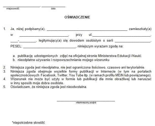 Do odpowiedzi dołączono wzór oświadczenia o wyrażeniu zgody, który resort wykorzystuje przy takich okazjach. Co ciekawe – choć pytanie dotyczyło zdjęć dzieci, z którymi fotografowani byli ministerialni urzędnicy – ministerialne oświadczenie wymaga wpisania numeru PESEL i nr dowodu osobistego – a to ostatnie w przypadku dziecka na ogół trudne. Nie jest też skierowane do opiekuna, bo dotyczy zgody na udostępnianie własnego wizerunku.