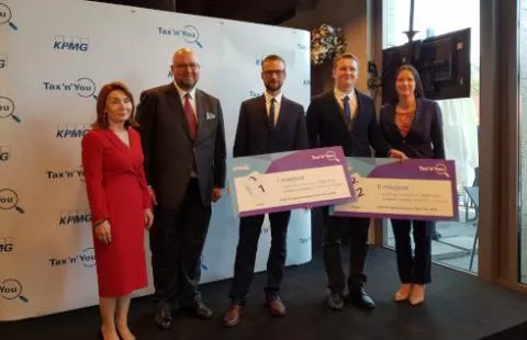 Na zdjęciu od lewej: prof. Hanna Litwińczuk z Uniwersytetu Warszawskiego, Peter Kay - szef Działu Doradztwa Podatkowego KPMG w Polsce i Europie Środkowo - Wschodniej, Maciej Kopycki - laureat I miejsca, Paweł Szala - laureat II miejsca, Ewa Usowicz - dyrektor Działu Serwisów Informacyjnych Wolters Kluwer Polska i członkini kapituły.