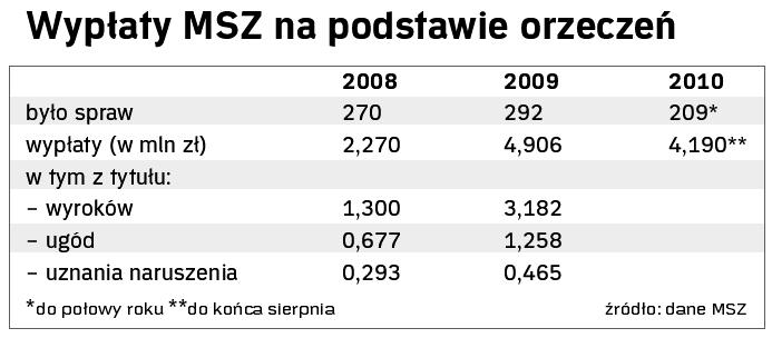 W 2010 roku Polska zapłaci 6 mln zł za rozpatrzone przez Trybunał w Strasburgu sprawy. W budżecie przewidziano na to nieco ponad 2 mln zł. Liczba spraw i sumy odszkodowań są coraz wyższe.
